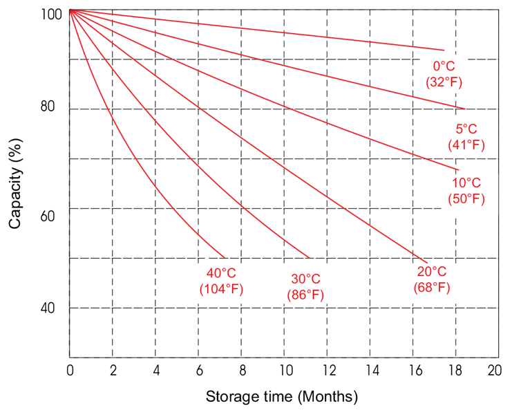 The operating environment temperature above 40°C should be avoided. After long term storage, the battery actual capacity would be less than the rated capacity. Full capacity will be obtained through several charge/discharge cycles.