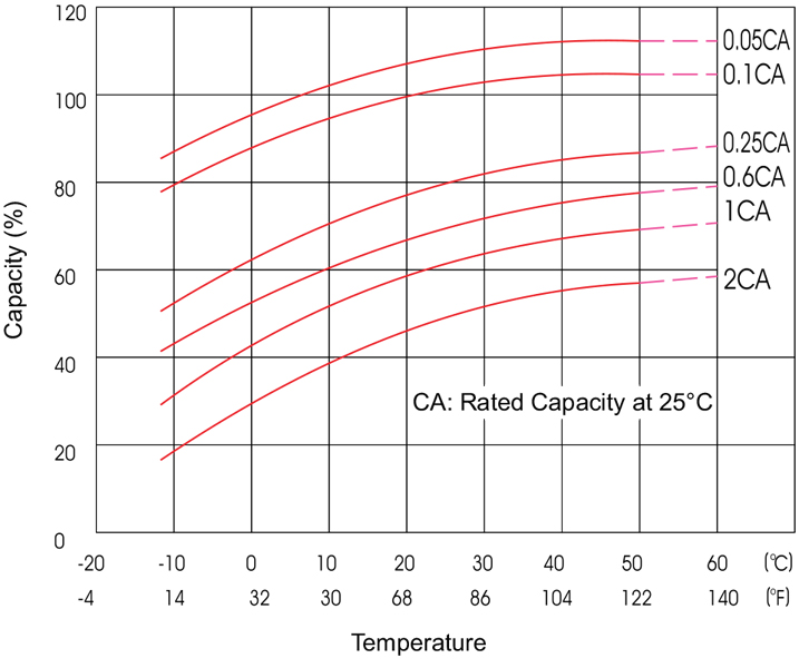 | Capacity Affected by Temperature (20 hour rate) | 104°F (40°C) | 102% | |
